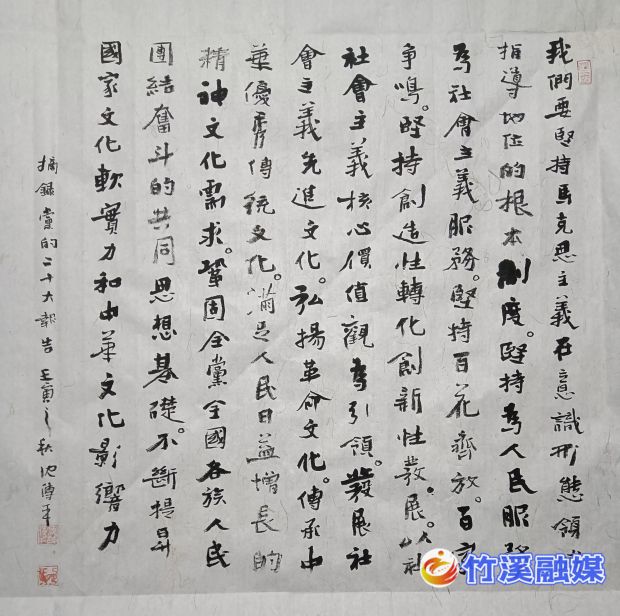 在书画展现场,近百幅以党的二十大、爱党爱国、党风廉政、乡村振兴、共同缔造为主题的书画作品一一陈列,书画作品内容丰富、寓意深刻、翰墨飘香,从不同角度、不同层面、不同形式,把对党、对家乡的热爱和美好生活的赞美,化作美轮美奂的线条与画面。作品中的一草一木、一山一石、一景一物,都饱含爱国爱党真情,以艺术手法展现竹溪经济社会发展成就和人民群众对未来愿景的美好期盼。