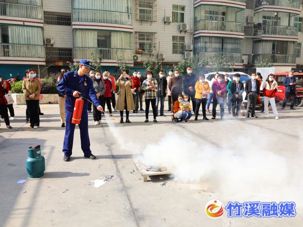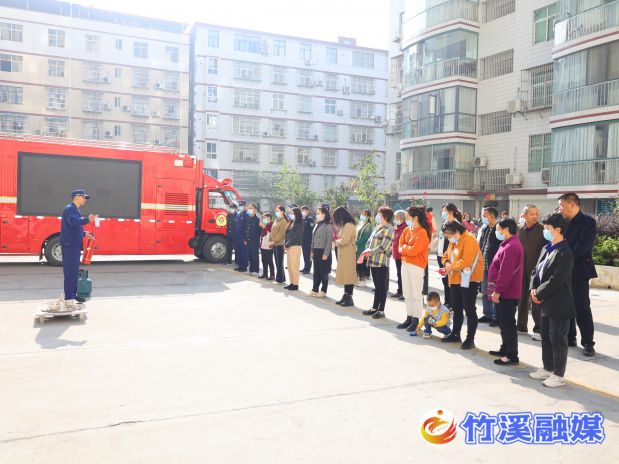 在了解居民的担忧后,10月25日,竹溪县消防救援大队联合应急管理局、城关镇政府、城关派出所、社区等单位组织开展了消防安全知识宣传和应急演练活动。城关镇各村、社区代表,辖区商超负责人和小区物业代表、城区社区工作人员、志愿者和部分居民代表参加了此次演练活动。