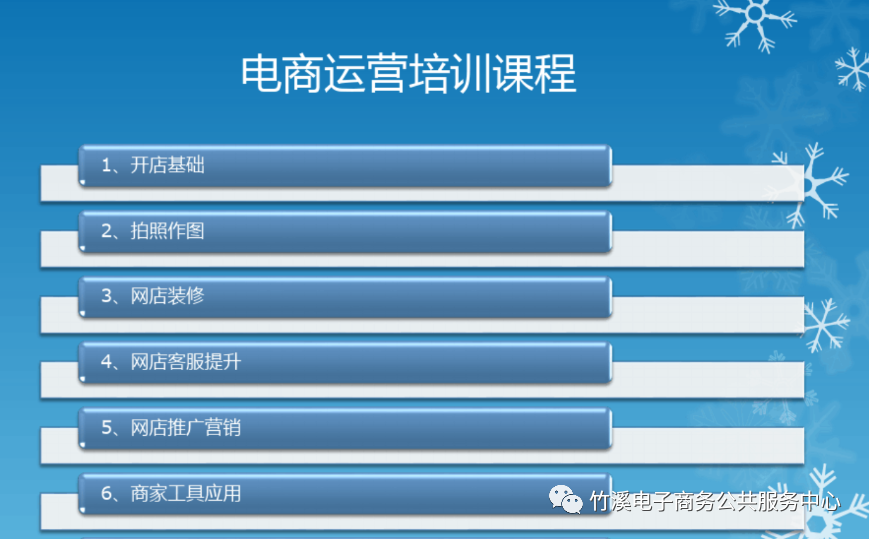 提供免费电商培训,包括电商平台解析、新媒体运营思路、创新创业思路、美工设计实操、短视频打造技巧。