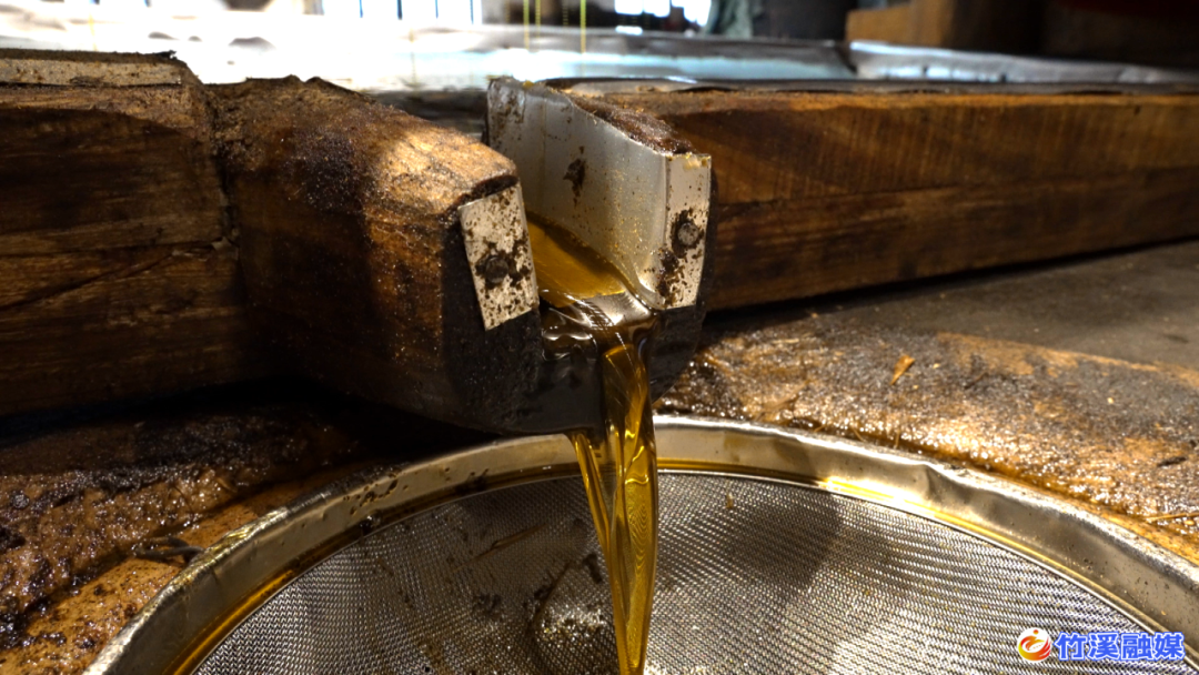 “一、二、三。”伴随着师傅们嘹亮的号子声,油磨坊博物馆里悬吊着的木锤,重重地撞击在木榨机的楔片上,发出一声声震耳的响声,一滴滴金灿灿的油从麸饼中被挤压出来。