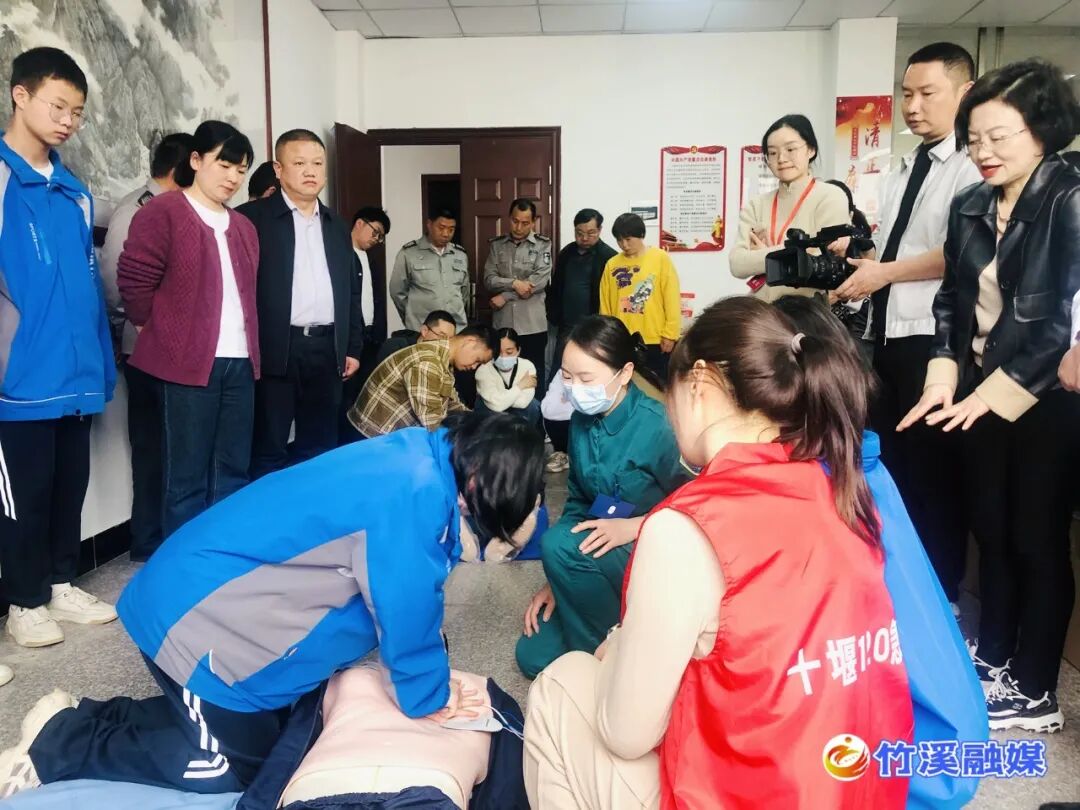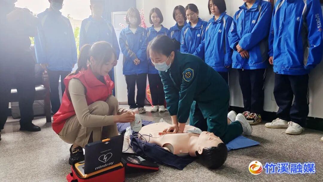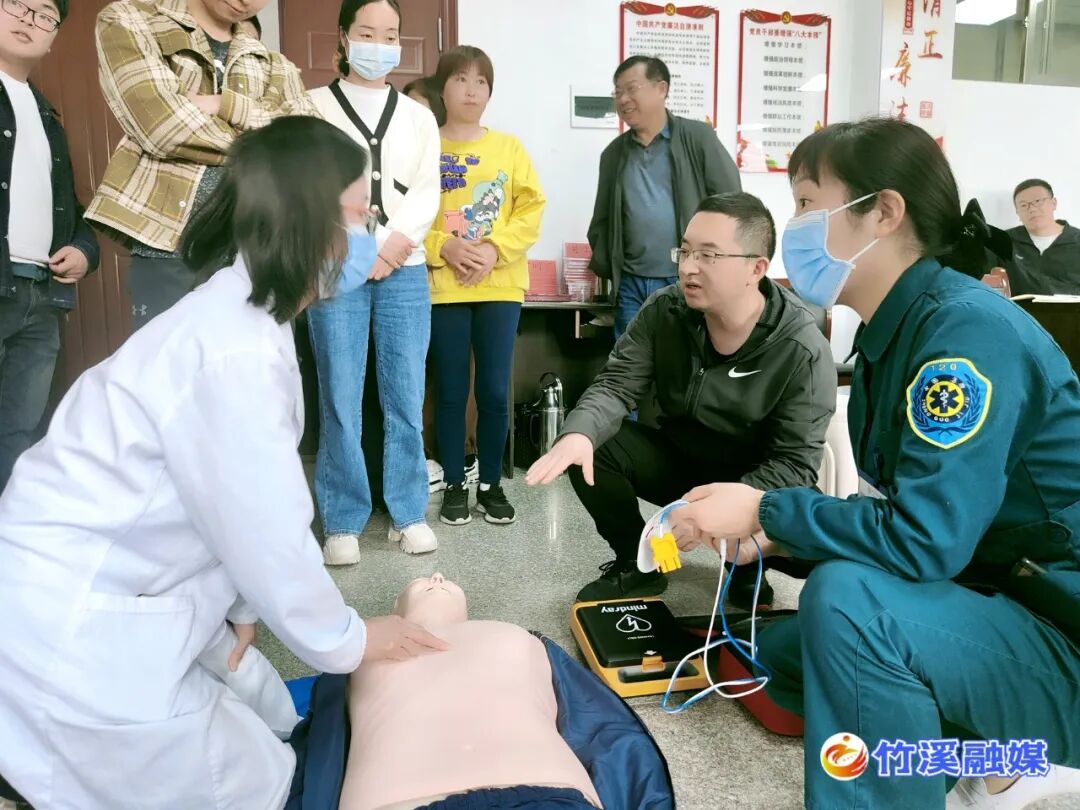 在培训现场,竹溪第一高级中学师生仔细倾听、认真学习,并在培训人员的指导下纷纷踊跃上台参与模拟实操,受训单位也表示将在今后用好AED,充分发挥其效能。
