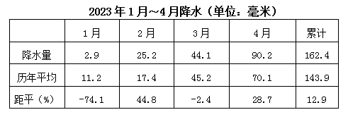 2023年1-4月国家站降水量162.4毫米,较历史同期偏多12.9%,其中1月偏少74.1%,2月偏多44.8%,3月偏少2.4%,4月偏多28.7%。