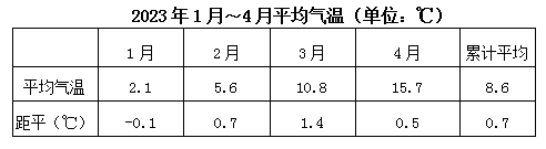 2023年1-4月,我县平均气温8.6℃,较历史同期偏高0.7℃,其中1月偏低0.1℃,2月偏高0.7℃,3月偏高1.4℃,4月偏高0.5℃;极端最高气温34.0℃(4月16日),极端最低气温-8.2℃(1月28日)。