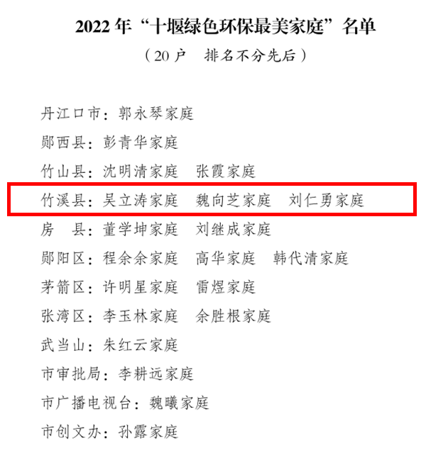 经申报推荐、综合评审等环节,市委文明办、市妇联决定授予王亚东家庭等30户家庭“十堰清正廉洁最美家庭”、郭永琴家庭等20户家庭“十堰绿色环保最美家庭”、 王艳君家庭等18户家庭“十堰书香传家最美家庭”、欧阳玲家庭等10户家庭“十堰孝老爱亲最美家庭”、郭梅家庭等10户家庭“十堰科学教子最美家庭”称号。