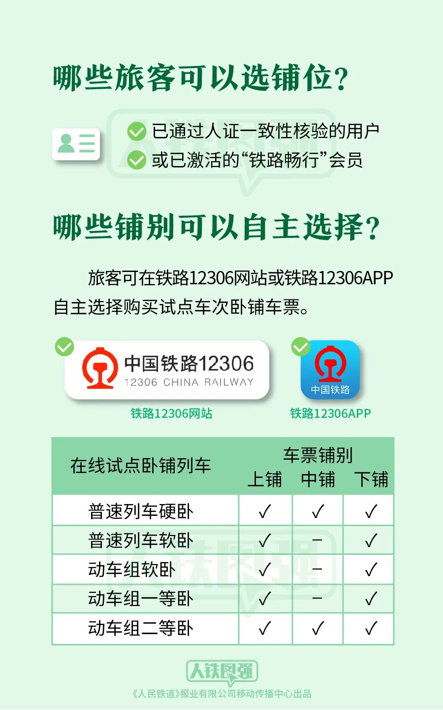 记者从中国国家铁路集团有限公司(下称“国铁集团”)获悉,6月10日,国铁集团在12306网站(含手机客户端)试行在线选铺服务,选择通达全国各区域的230趟高铁、普速旅客列车作为试点,对普速列车软卧、硬卧和动车组软卧、一等卧、二等卧等铺别提供在线自主选铺服务,同时,继续实行对60岁以上老人等重点旅客优先分配下铺的服务。