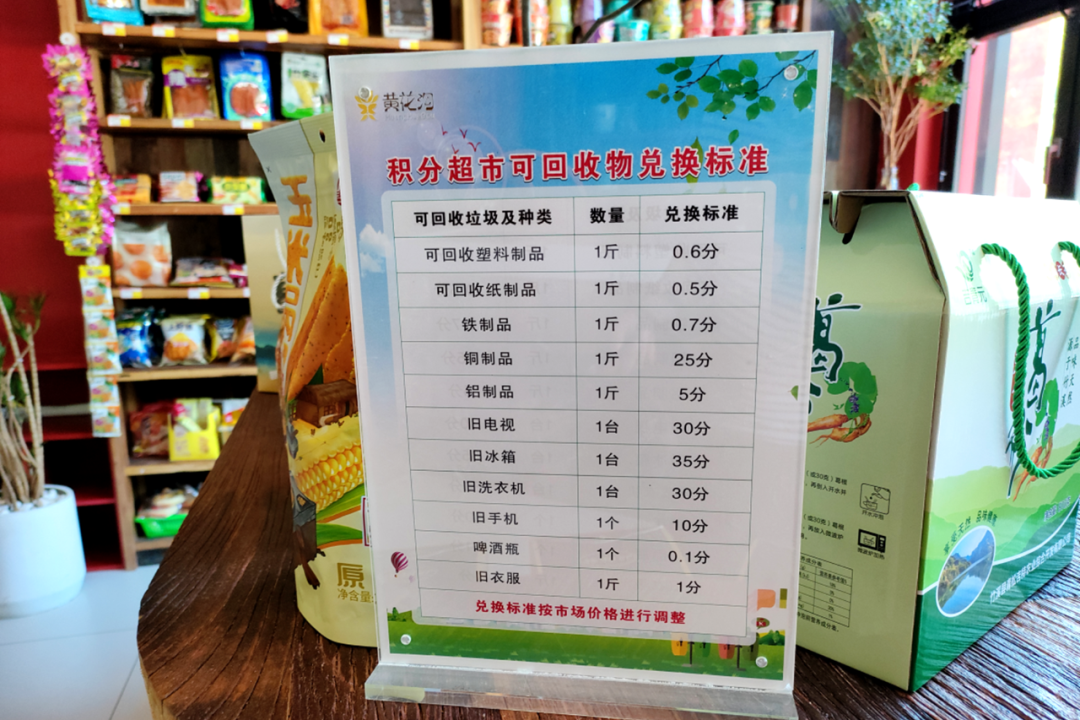 “除开村民参与村级事务获得的积分可以兑换生活用品外,平日里,村民家里的旧电视、旧冰箱、旧洗衣机、旧手机、旧衣服等废弃物品也能兑换成相应积分,换取生活用品,有利于我们村的垃圾分类和废物利用,实现了保护爱护环境。”黄花沟村积分超市负责人申林艳介绍。