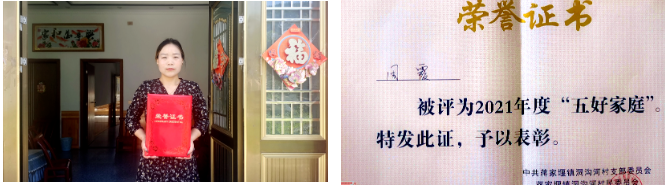 虽然生活压力大、负担重,但周霞从未喊苦叫累,她感觉自己付出得很值得,感受到家庭幸福和温暖。2021年,通过全村村民集中评选,她家被评为全村“五好家庭”。