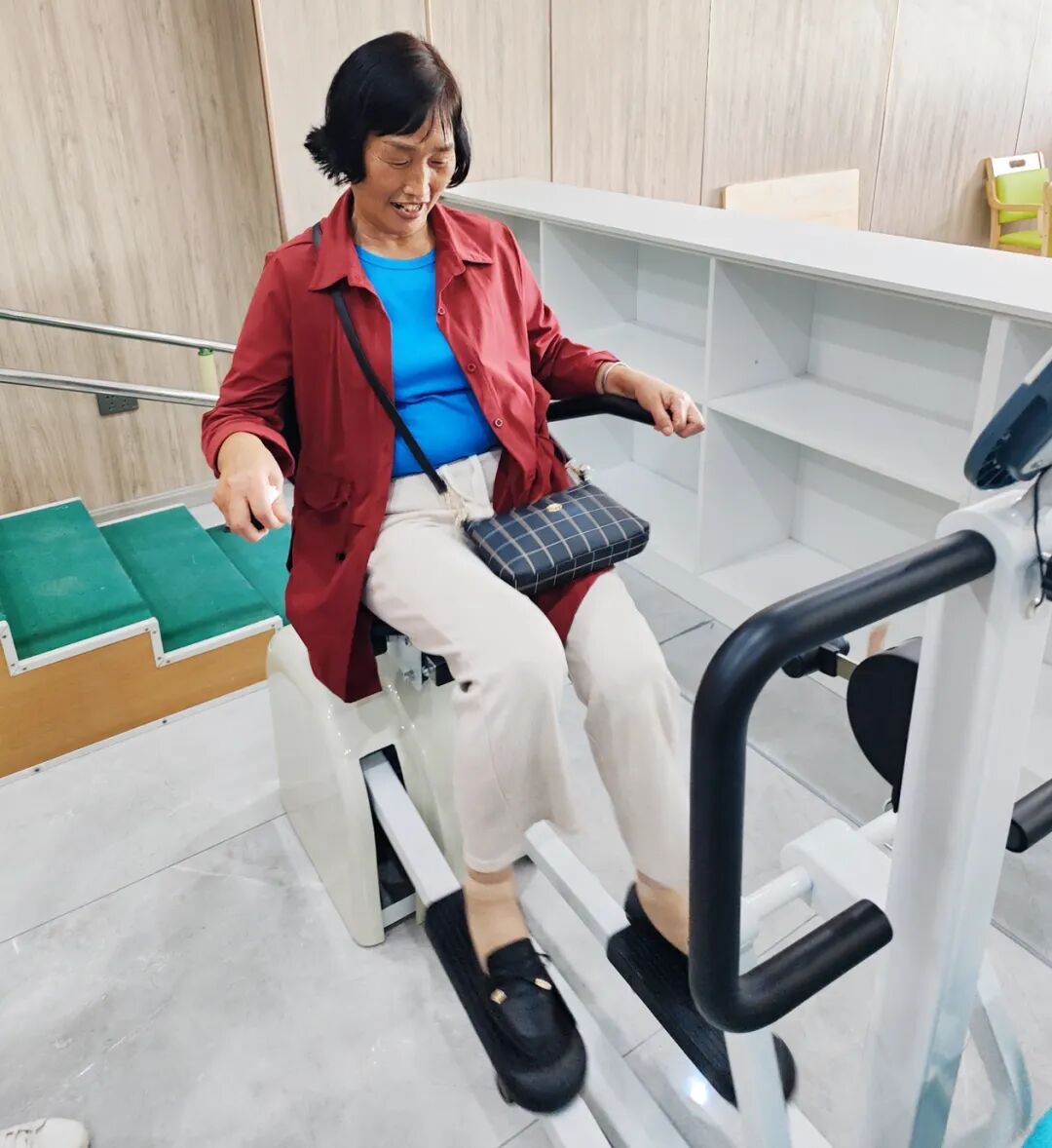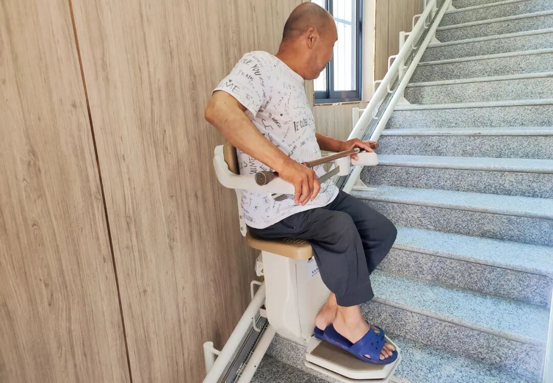 该村“幸福食堂”在建设之初就综合考虑了老年人的规模、就餐需求等因素,在室内环境、桌椅、地面防滑等方面都做了适老化功能设计。为有效缓解高龄老年人上下楼不便的问题,食堂还在楼梯口加装了座椅升降机,座椅两侧都安装有扶手,升降机上有控制上下的摇杆,老人坐定后系上安全带,就可开始“自助爬楼”。