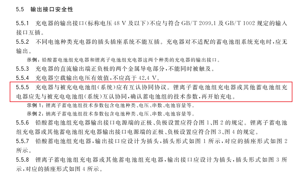 第5.5.5条规定,充电器与被充电电池组(系统)应有互认协同协议。锂离子蓄电池组充电器或其他蓄电池组充电器应先与被充电电池组(系统)互认协同,确认蓄电池组的技术参数,再开始充电。