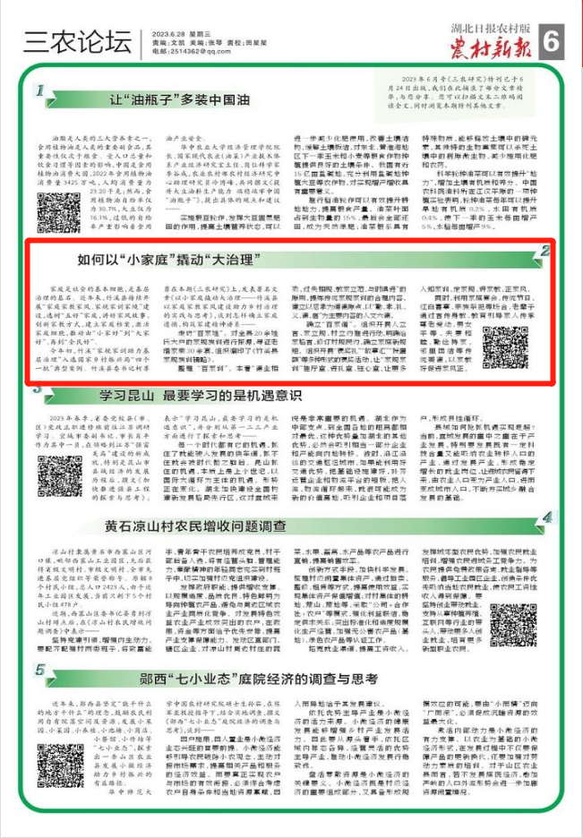 日前,全省唯一一张专门指导、服务全省“三农”工作的党报——《农村新报》刊发了县委书记柯尊勇署名文章《以小家庭撬动大治理——竹溪县以家庭家教家风建设助力乡村治理的实践与思考》。文章介绍了竹溪县持续开展“家庭家教家风、家规家训家境”建设,选树“五好”家庭,讲好家风故事,创新家教方式,建立家庭档案,激活家庭细胞,推动由“小家好”到“大家好”、再到“全民好”,进而形成“家建好、郡县治、天下安”的生动局面。