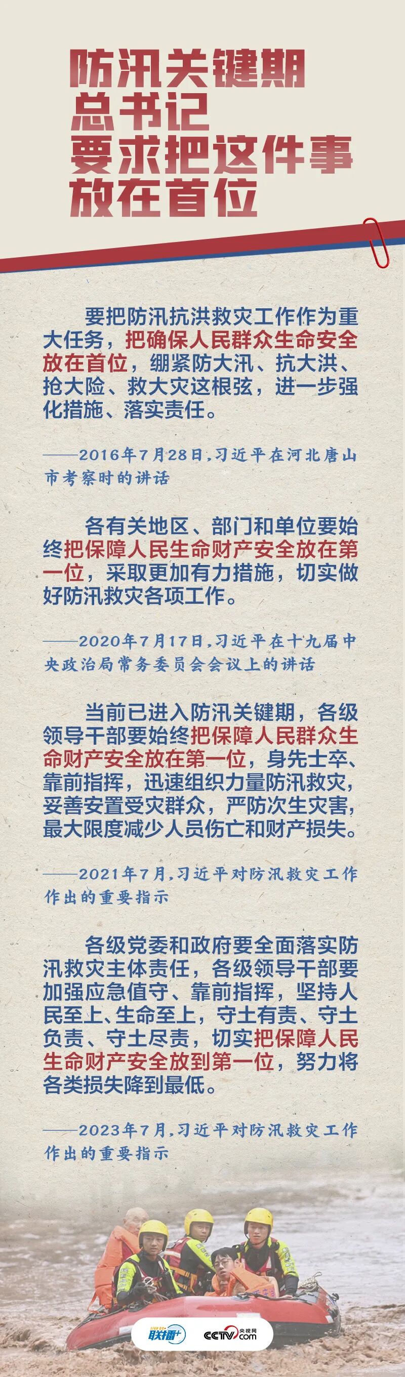 “七下八上”(七月下半月至八月上半月)是我国防汛关键期。近日,重庆等地遭遇强降雨,一些河流发生超警以上洪水。习近平总书记对防汛救灾工作作出重要指示,再一次强调“把保障人民生命财产安全放到第一位”。防汛救灾,总书记“时时放心不下”,人民至上立场一以贯之。
