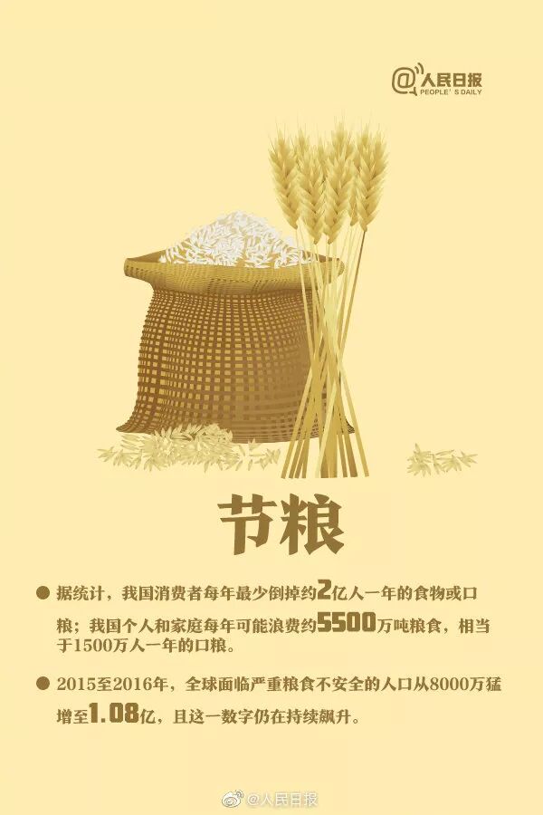“谁知盘中餐,粒粒皆辛苦”,可是现在浪费粮食的现象仍比较严重,而少浪费0.5千克粮食(以水稻为例),可节能约0.18千克标准煤,相应减排二氧化碳0.47千克。如果全国平均每人每年减少粮食浪费0.5千克,每年可节能约24.1万吨标准煤,减排二氧化碳61.2万吨。