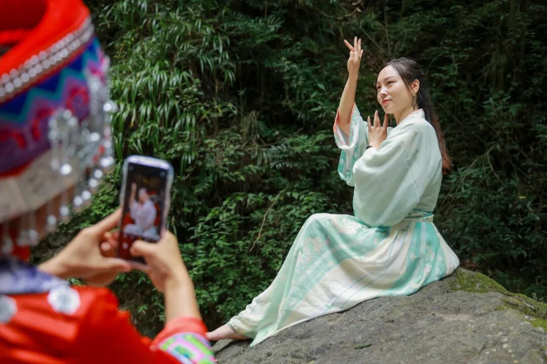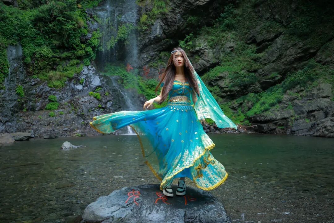 高山瀑布飞流直下,潭中泉水波光粼粼,网红达人们身穿民族特色服饰,或翩然起舞,或池中戏水。