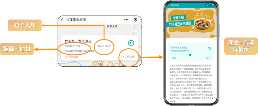 “竹溪美食地图”的专属语音包由专业主播录制,系统依托LBS技术,实现抵达目的地时音频自动播放的有声伴游体验,为游客们开启一场会说话的美食之旅。