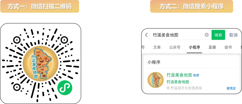方式二:点击手机微信右上角放大镜进入搜索页面,输入“竹溪美食地图”,选择“小程序”类目即可进入。