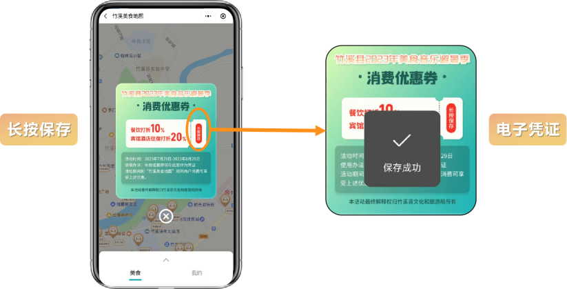 该优惠券的使用时间为2023年7月29日-2023年8月29日,长按或者截屏保存电子凭证,在活动期间到“竹溪美食地图”所列商户消费即可享受专属优惠。
