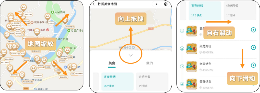 游客可以在互动程序中浏览全域美食地图,赏味遍布竹溪各个角落的美食宝地,从当地特色小吃到传统家常菜,都能用一部手机完成打卡。全域美食类目清晰,地图操作简单,配合缩放、拖拽、滑动,让游客们可以快速浏览各类美食,轻松找到青睐的美食目的地。
