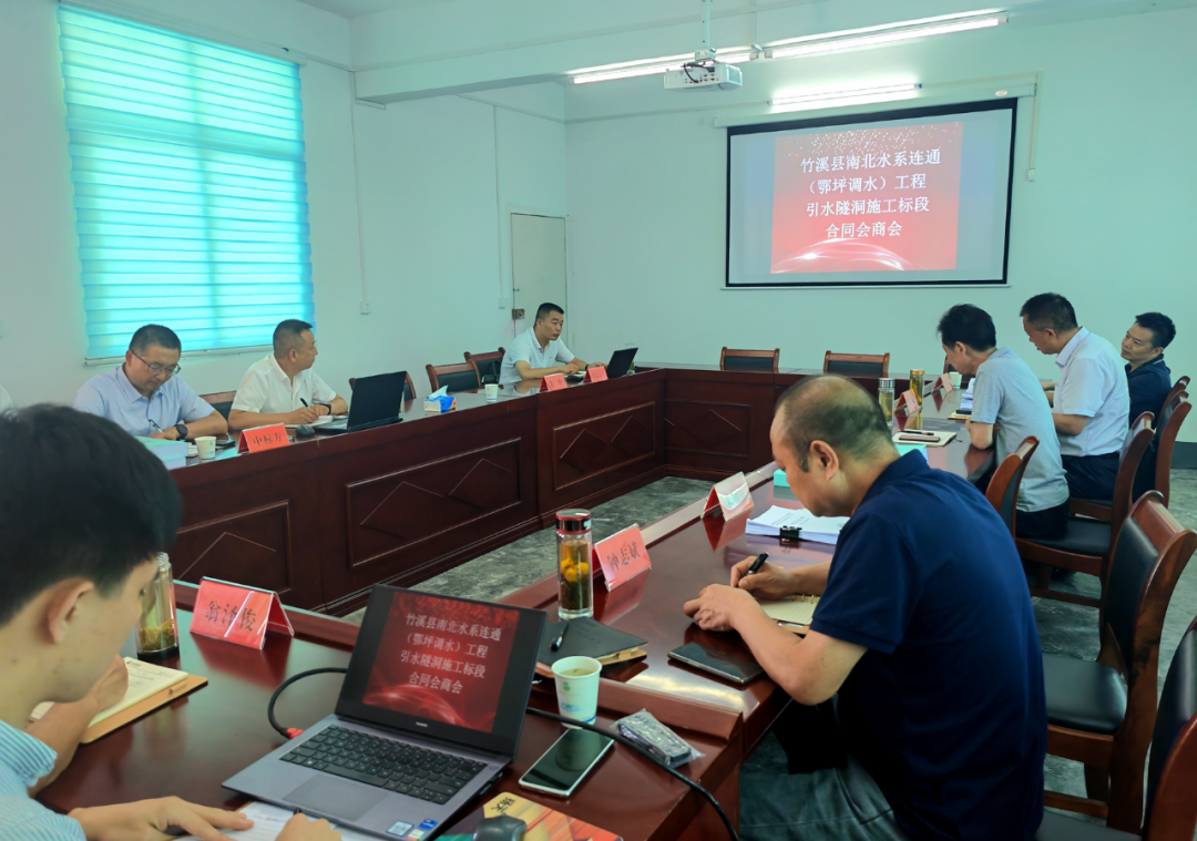 7月31日,县人大常委会副主任彭志强参加南北水系连通工程引水隧洞施工标段合同会商会。