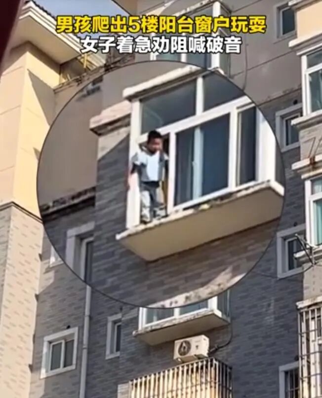 日前,江西南昌一女子发现一名男孩爬出五楼阳台窗户玩耍,阳台外未安装护栏等任何保护措施,十分着急地向男孩喊话,劝阻男孩的行为,让他快点回去。