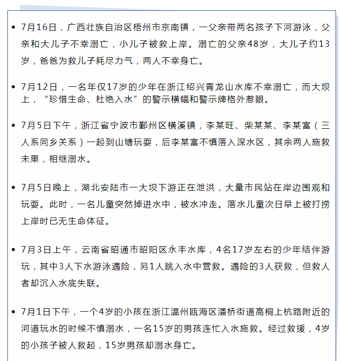 6、发现溺水者,立即寻求成人帮助,同时可向溺水者抛救生圈、泡沫板、救生绳等,但不可盲目施救。