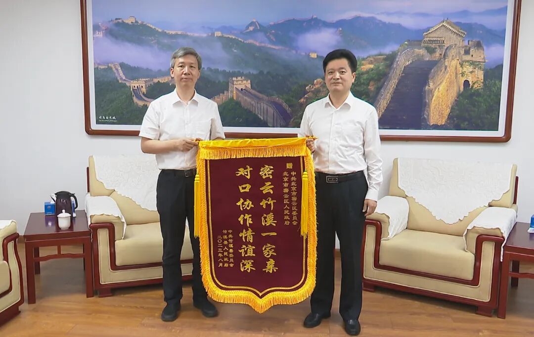 (全媒体记者 杨秦青)8月28日至29日,县委书记柯尊勇带领竹溪县党政考察团赴北京市密云区考察调研对接南水北调对口协作,向密云区赠送“密云竹溪一家亲、对口协作情谊深”的锦旗,同北京市密云区委书记余卫国,区委副书记、区长马新明进行会谈交流,深入推进对口支援协作和全方位交流合作。