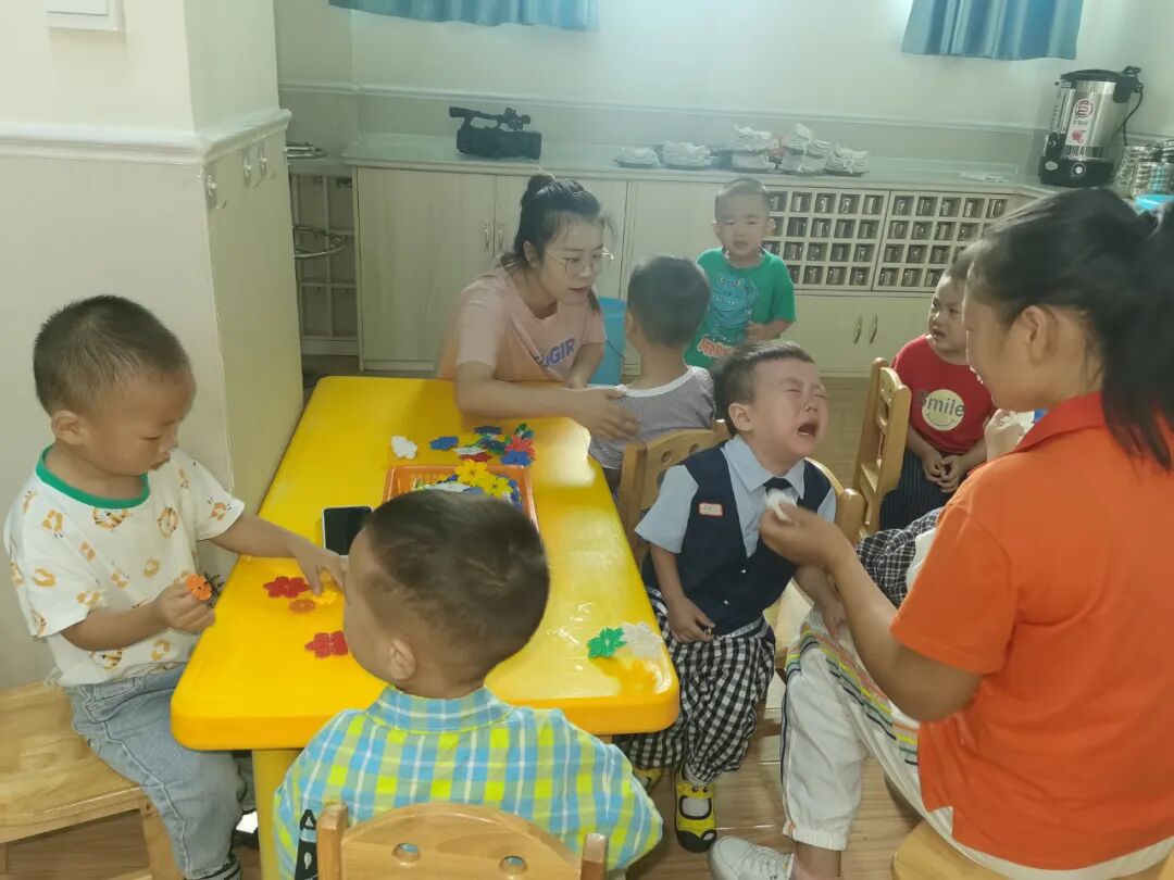 小班的教室里好不热闹,刚入园的小朋友们还没完全适应新环境,有的开始哭鼻子,幼师们不停地安抚孩子们,或抱在怀里讲故事,或引导他们玩玩具,大家忙得不亦乐乎。到早餐时间,幼师们耐心地照顾每位小朋友,还不断地给他们加油打气,帮助孩子们快速适应新学期生活。