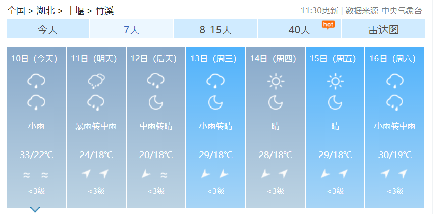 未来两天,竹溪天气如何?预计今天白天,我县多云有分散性阵雨,夜间转小雨,明天有大雨,局部暴雨,后天小到中雨转多云