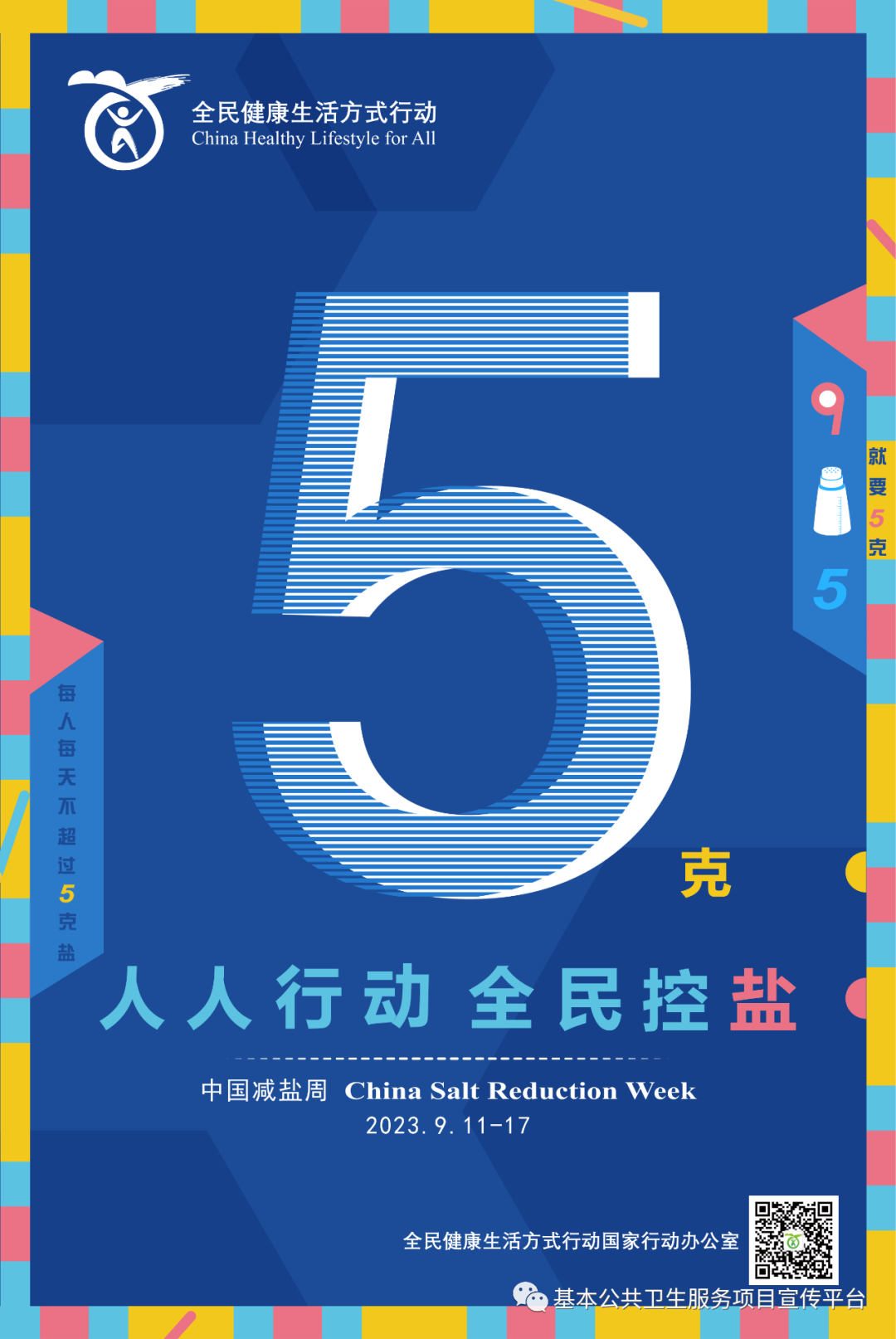 全民健康生活方式行动国家行动办公室制作了主题宣传海报,继续向公众传播“就要5克”的减盐理念和生活技巧,引导每个人知晓自己的口味及食盐摄入量,倡导“人人行动 全民控盐”,促进公众养成健康的生活习惯。