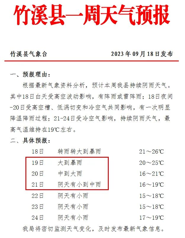 9月18日21时,竹溪县气象部门再次发布重大气象信息专报。据最新气象资料分析,受高空槽、低涡切变和冷空气共同影响,18日至21日,我县将出现强降温、强降雨天气过程,预计今晚我县大到暴雨,后天中到大雨。