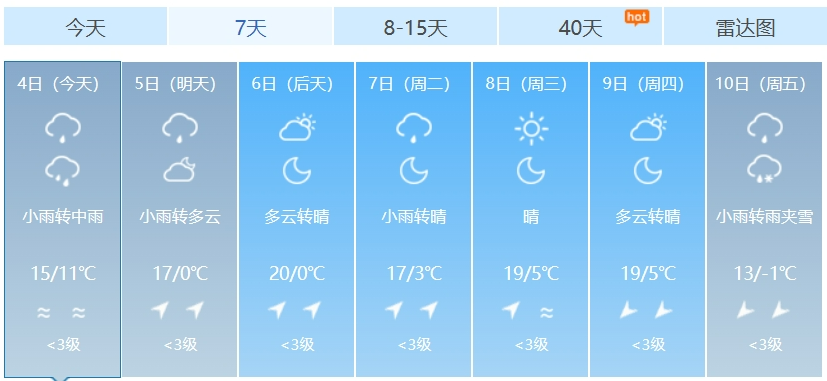 预计今天白天我县阴天转小雨,夜间阴天有小到中雨;明天小雨转多云。