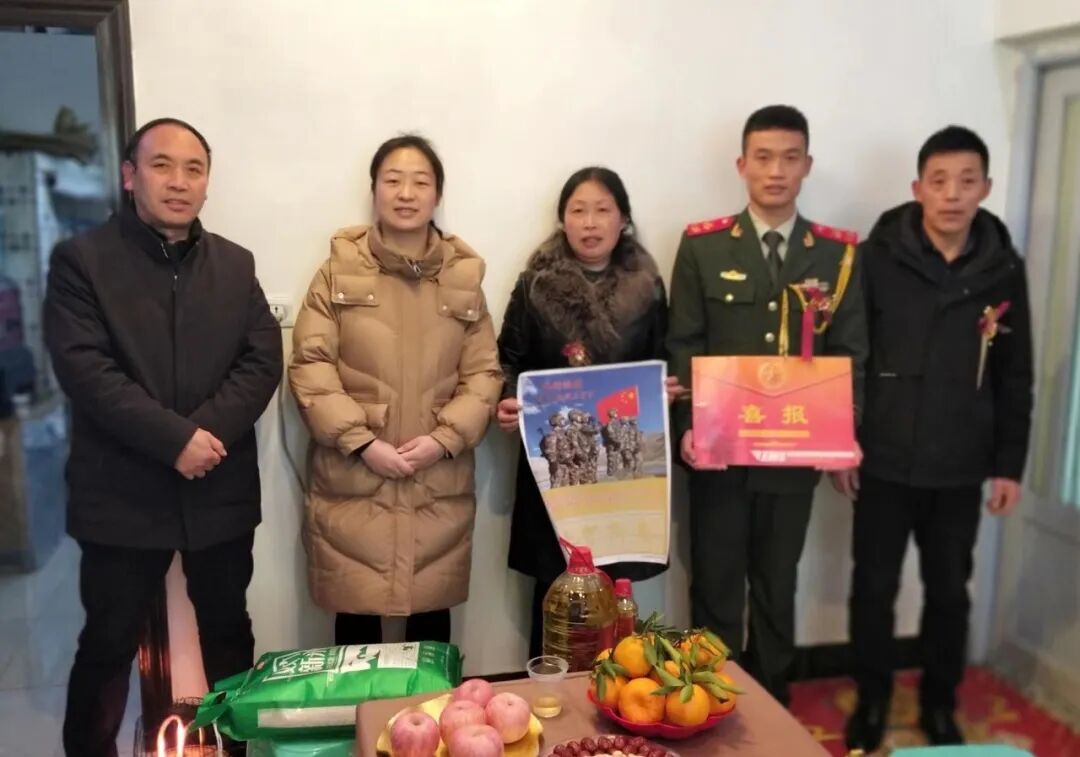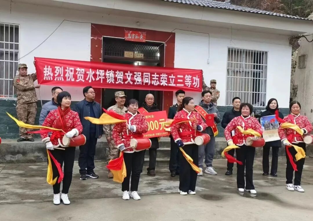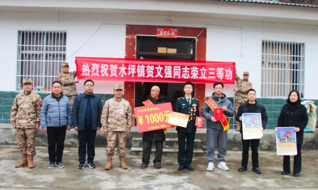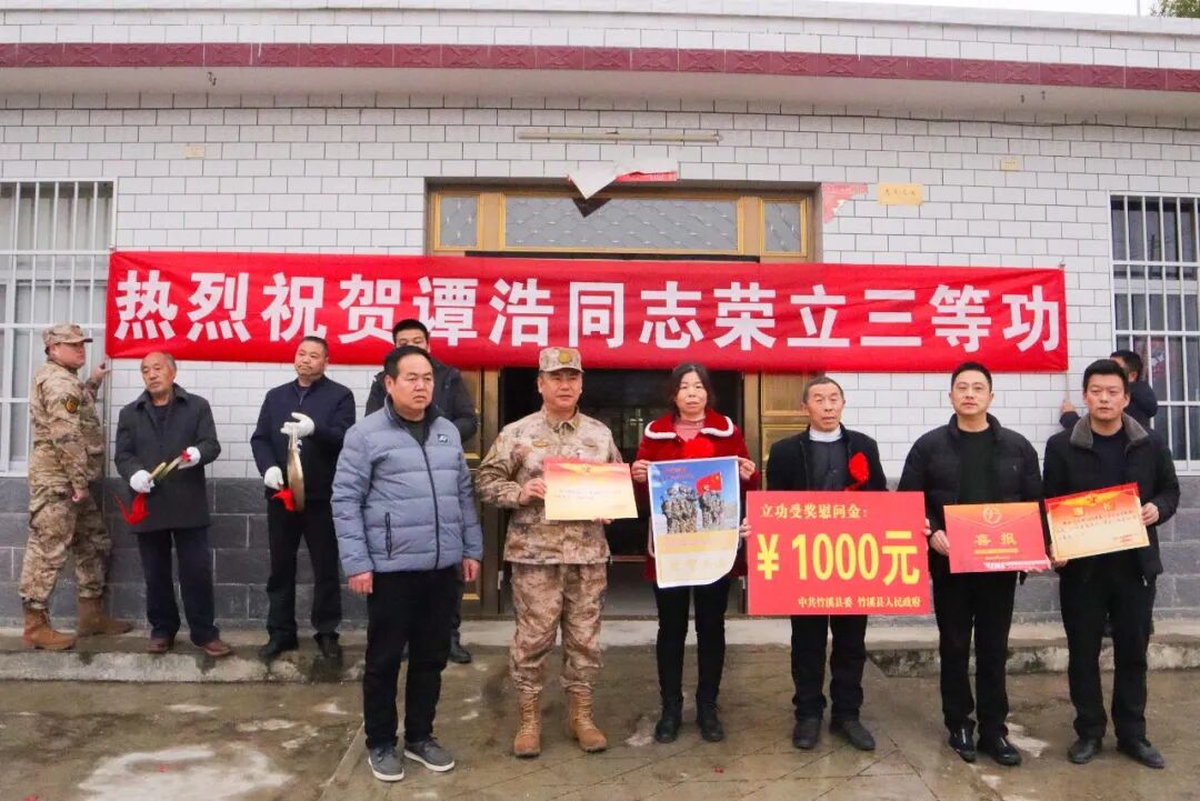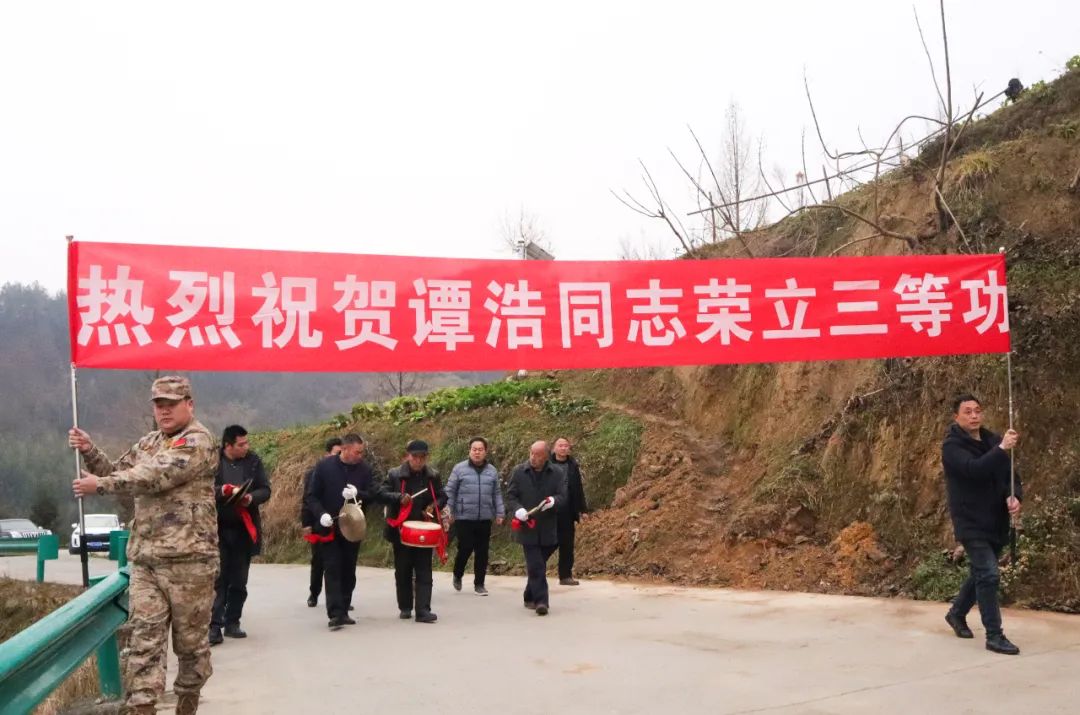 1月16日,在中峰镇和水坪镇,由县人武部、县退役军人事务局组成的报喜团,还先后来到现役军人谭浩和贺文强的家中,为他们送去了“三等功”喜报。