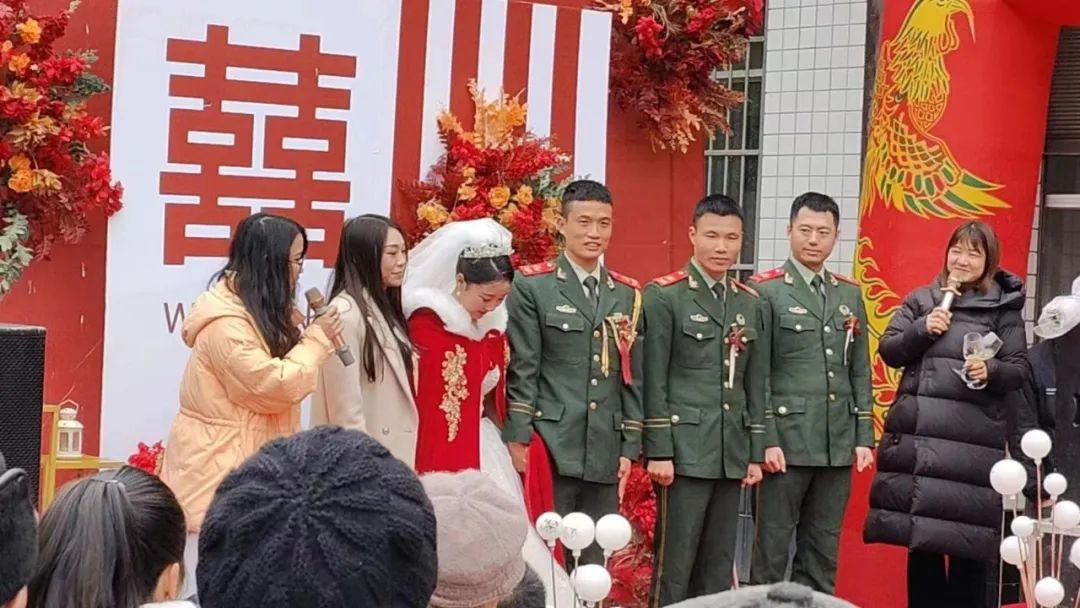 婚礼现场爆竹声声、宾客盈门,现役军人张吉锐与新婚妻子在亲朋好友的见证下收到了来自部队的喜报,当天可谓喜上加喜,双喜临门。
