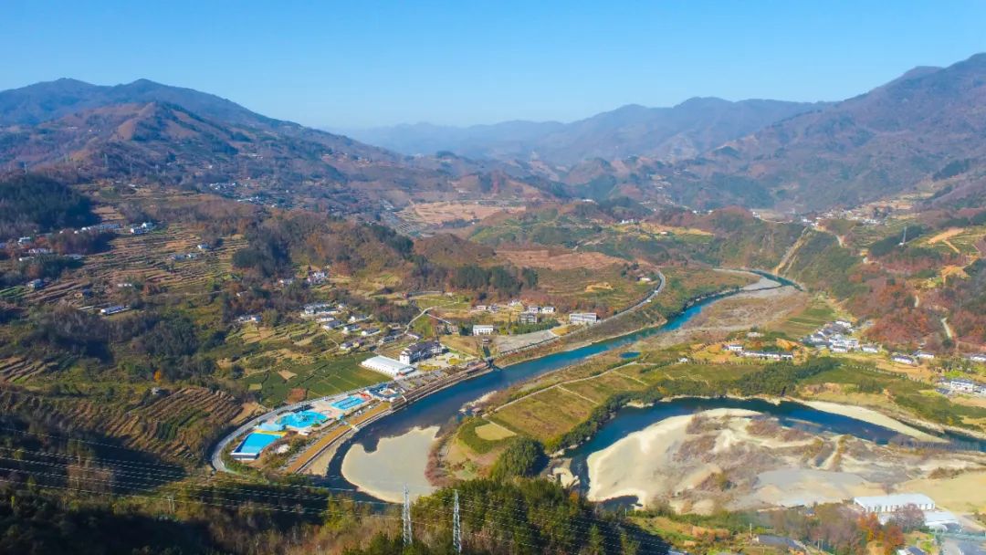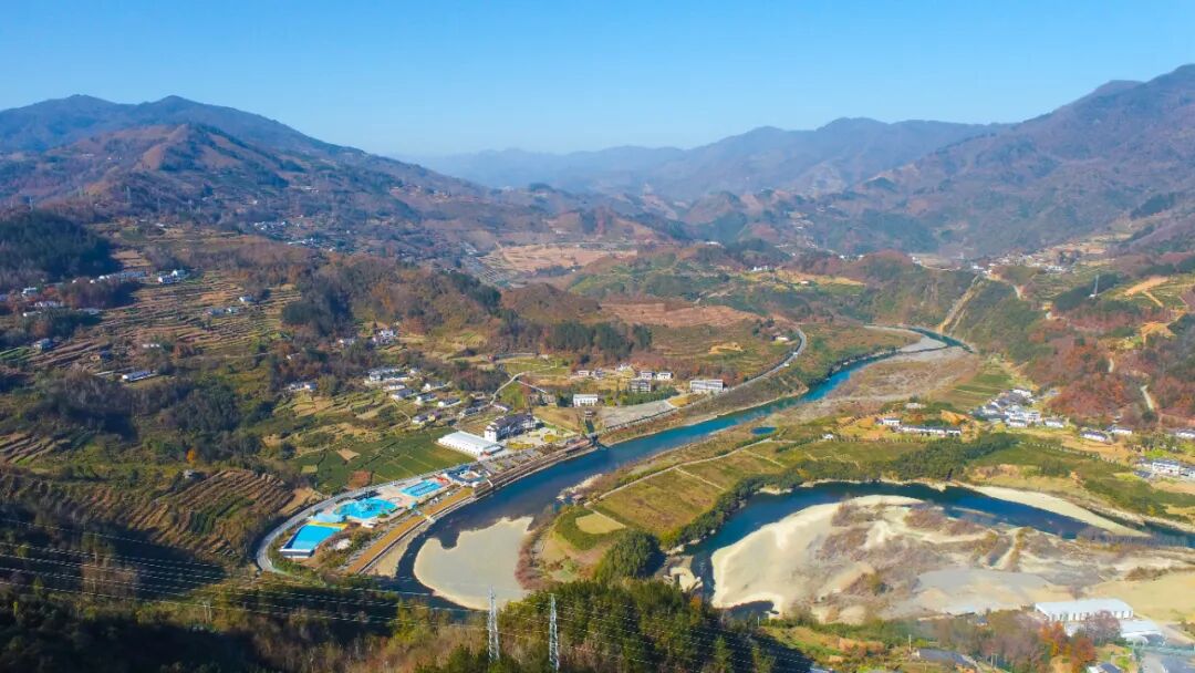 湛蓝澄澈的天空、温暖静谧的朝阳、层林尽染的山峰倒映在青翠欲滴的溪水中,宛如画境。