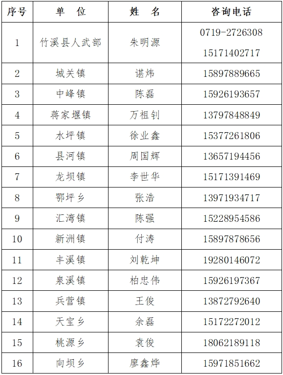 竹溪各级民兵工作咨询电话