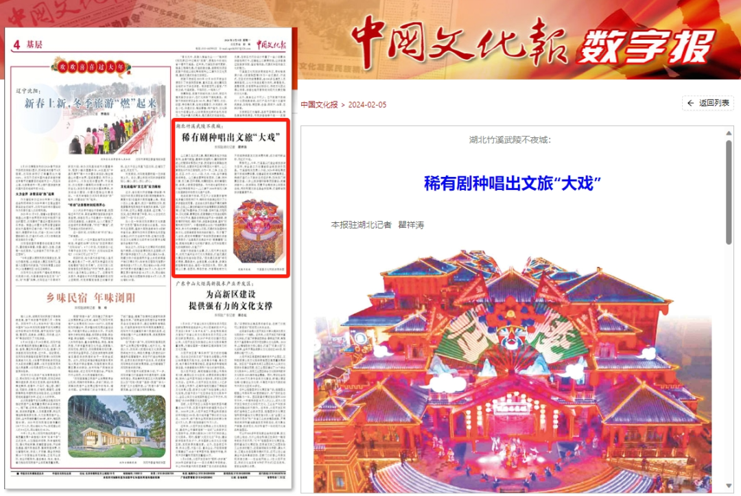 今日,《中国文化报》在显著位置大篇幅报道我县武陵不夜城创造性转化、创新性发展山二黄非遗文化,推进文化惠民和旅游演艺有机融合、双向提升的做法。