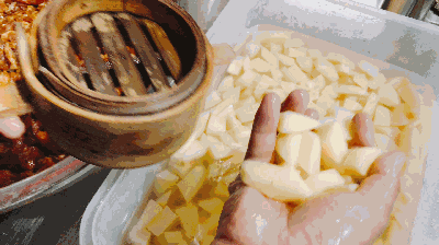 洋芋块儿打底,上面铺满粉蒸排骨(或肥肠),光是看一眼就叫人垂涎欲滴,夹起一块放入口中,香味蔓延开来,满足的一天就此开启。