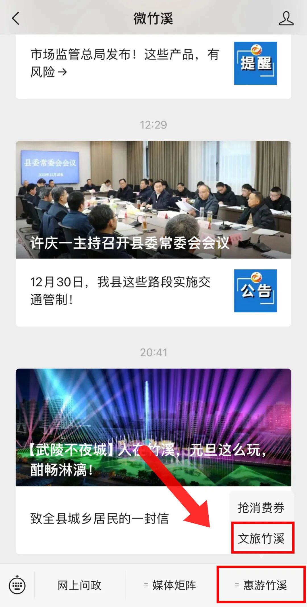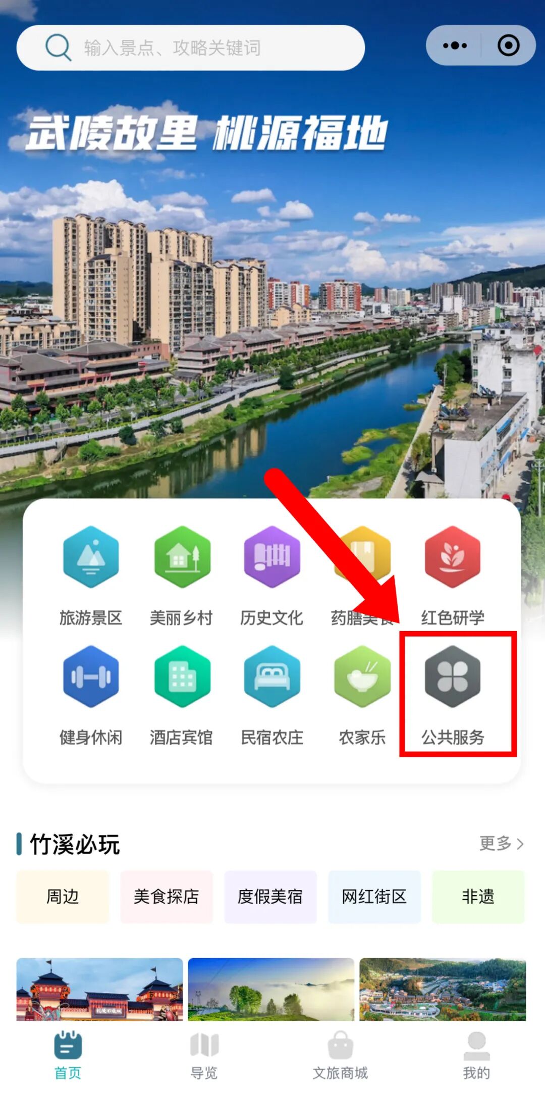 第二步:进入微竹溪微信公众号,点击【惠游竹溪】-【文旅竹溪】,再点击【开启旅途】即可进入