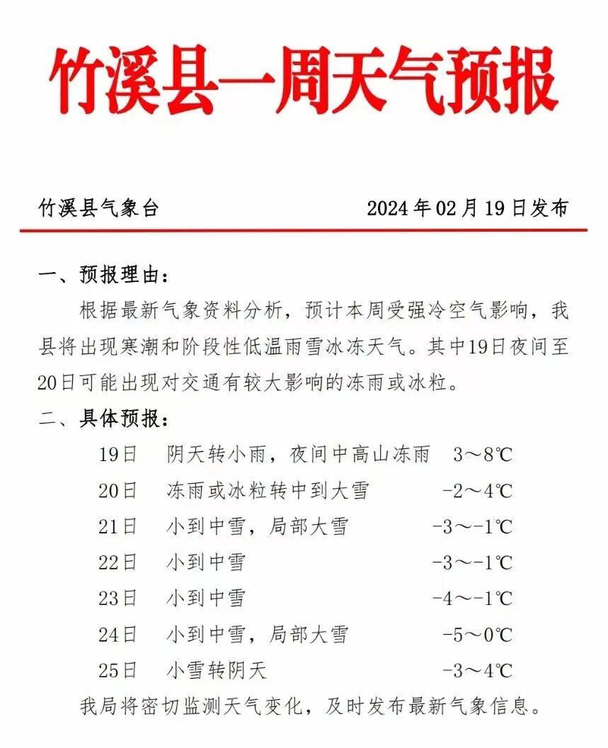 刚刚竹溪县气象灾害应急指挥部发布,关于启动竹溪县气象灾害(寒潮)Ⅲ级应急响应的通知。