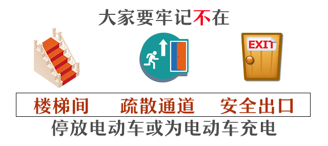 严禁在建筑内的共用走道、楼梯间、安全出口处等公共区域停放电动车或者为电动车充电,严禁电动车“上楼入户”。
