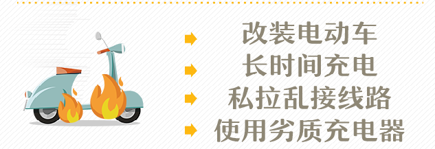 部分车主擅自改装电动车的动力电源,破坏整车电气线路的安全性能,容易引发车辆电气线路过载、短路等故障,引起火灾事故的概率相对增大。