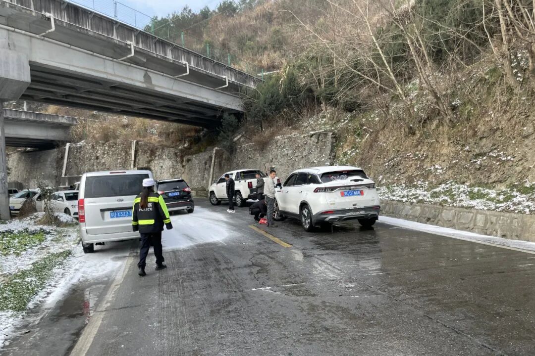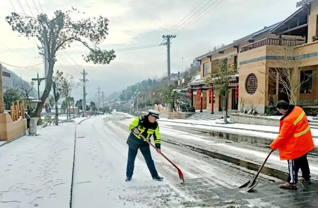 在观音阁、北大街、人民路、康家岭等路段,民辅警们有的在路面上抛洒融雪盐,有的挥锹铲雪,还有的对过往车辆和行人进行交通劝导,叮嘱行人走人行道。针对南部乡镇,气温低、积雪厚、冰冻严重,干警们在进入南部山区的路口设立劝导站,帮助驾驶员朋友安装防滑链,宣传交通安全知识,对存在交通安全隐患、没有安装防滑链、不符合上路标准的车辆进行劝返,确保人民群众生命安全。全县设有四个交通安全卡点,同步发挥交通指挥、监管、劝导、保畅作用。