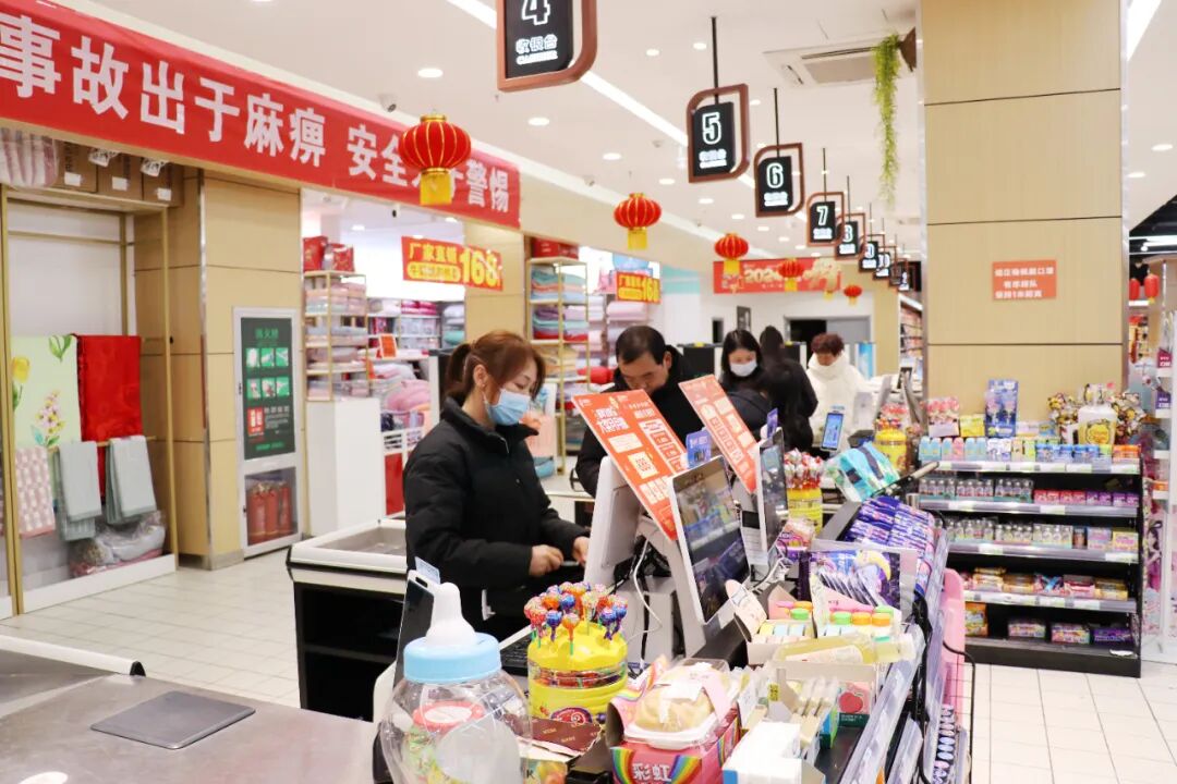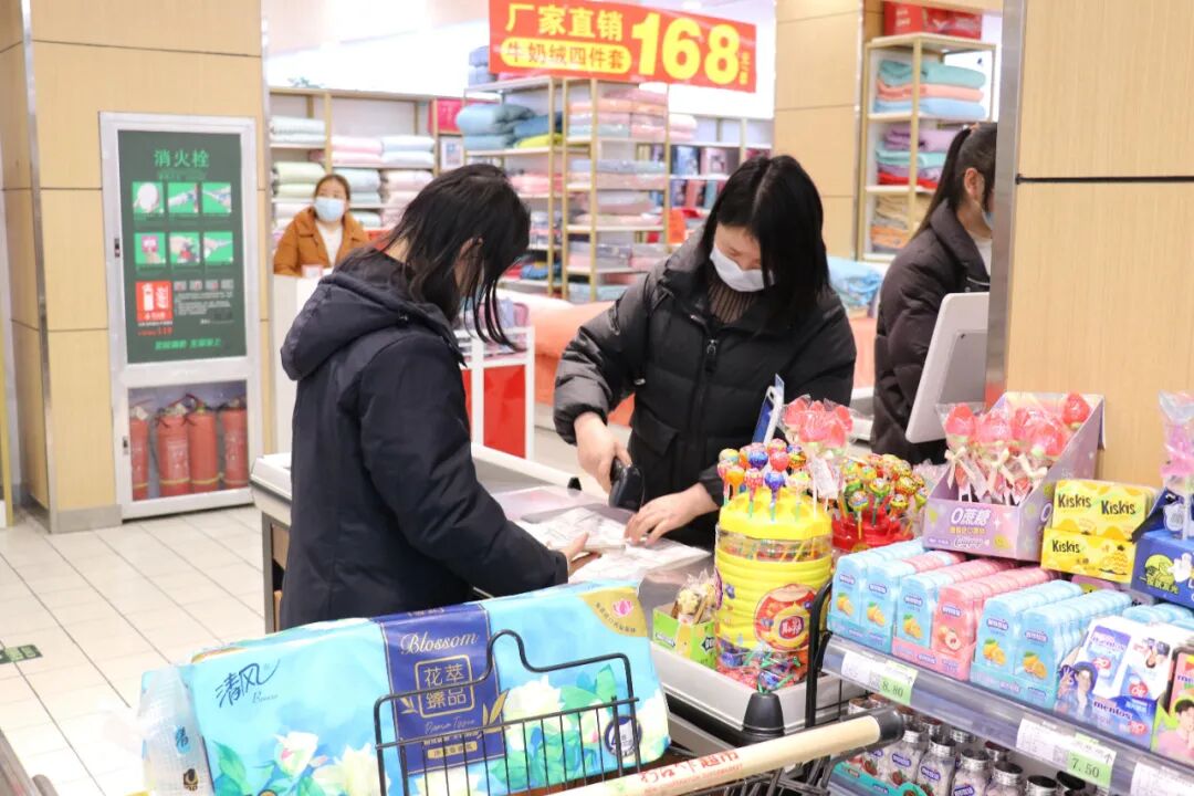 2月22日,屋外雪花飘落,地处邮电街的新合作超市内却是人头攒动,记者在现场看到,超市内粮油米面、生活用品等各种物资储备充足,市民们正在选购商品。