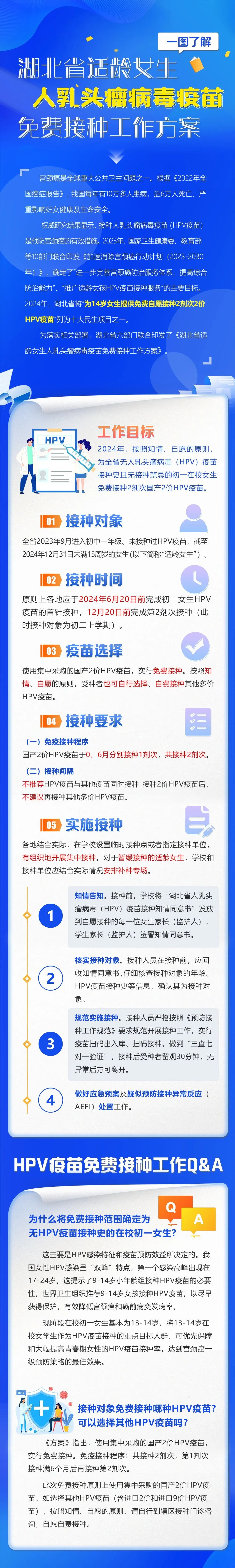 湖北省近日印发《湖北省适龄女生人乳头瘤病毒疫苗免费接种工作方案》正式启动该项工作。接种对象是谁?接种何时完成?疫苗如何选择?一图了解。