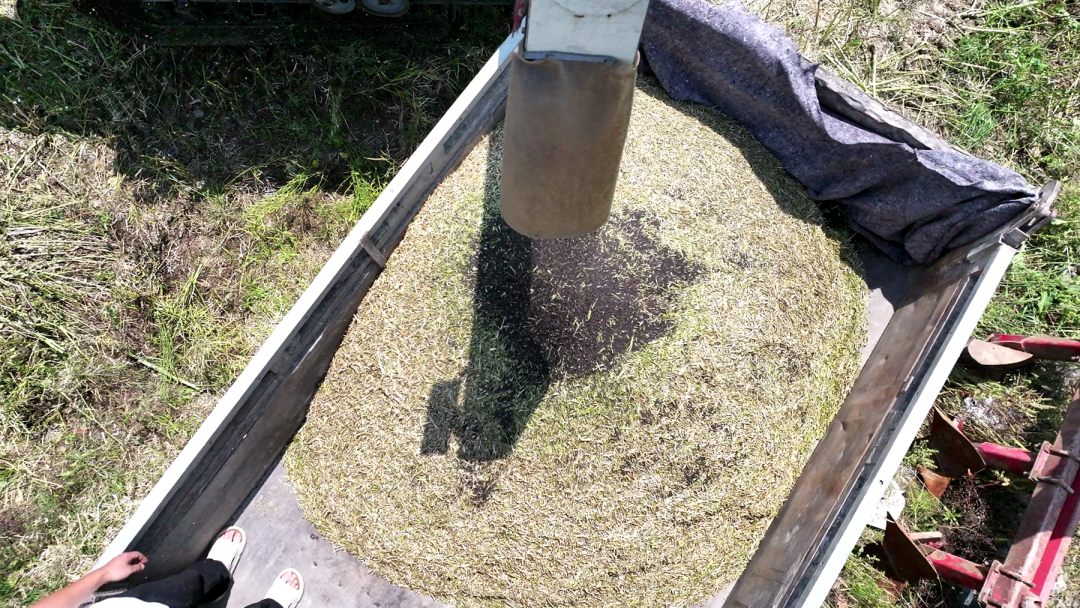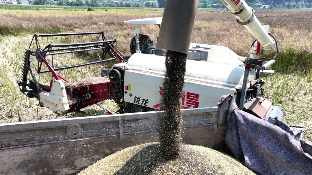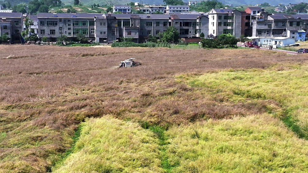 农机手正驾驶着履带式收割机来回穿梭其间,齿轮转动间,一株株饱满的油菜荚被卷起,脱粒、粉碎、清选、分离等工序一气呵成。一台收割机工作10分钟就能让一亩地的油菜籽尽数归仓,打碎的秸秆就地还田,既清洁环保,又高效利用。