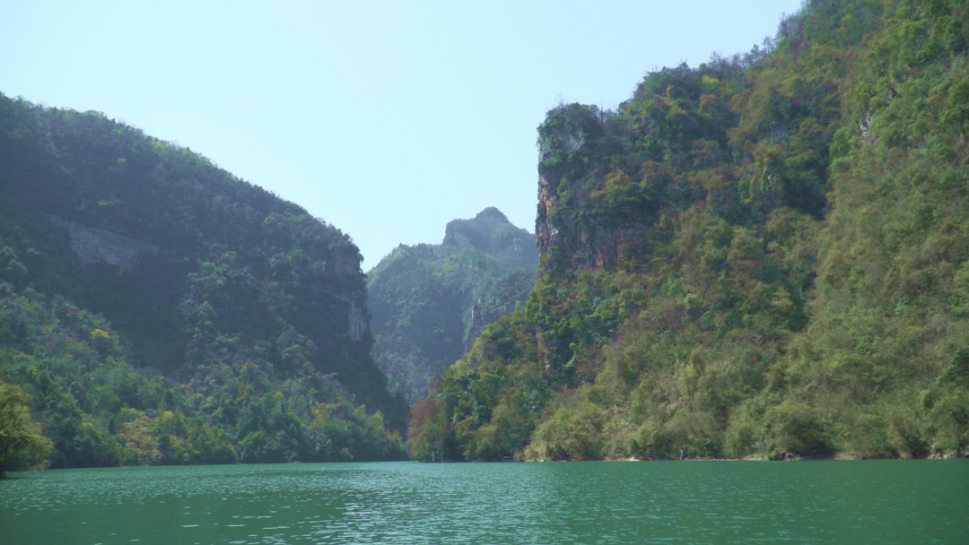 峡内气势雄伟,“石门”两旁黄褐色相间的岩石在浩渺水波的映衬下,像耸立在狭窄水道上的一道钢铁雄关,两侧郁郁葱葱的群峰从远方绵延蜿蜒而来,在即将“会师”时却被河水拦腰斩断,留下两道刀劈斧砍般气势雄浑的岩壁。