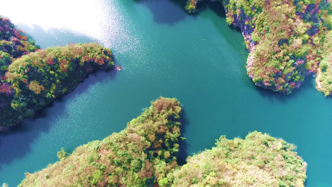 清澈晶莹的水面宛如一枚枚碧绿的宝石镶嵌在群山赤峰之间,水光如镜,群峰竞秀,相映成趣,美不胜收。