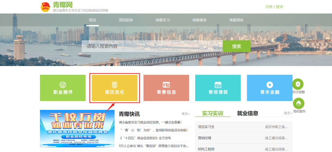 2.完善个人简历,登录成功后,进入“简历优化”界面,完善个人简历信息。可在线填写个人简历信息后生成在线简历,也可以附件形式上传个人简历。