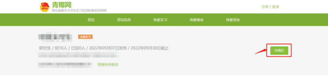 3.查看岗位信息及投递简历,进入“我要实习”页面,在“搜索栏”中搜索关键词“竹溪”,查看家乡详细岗位信息,找到心仪岗位,一键点击“投简历”即可,相关投递信息可在个人中心“我的投递”中查看。