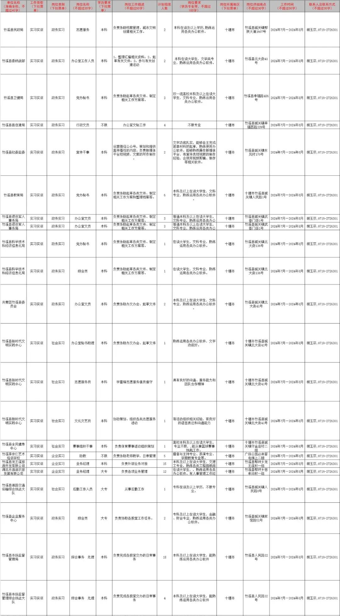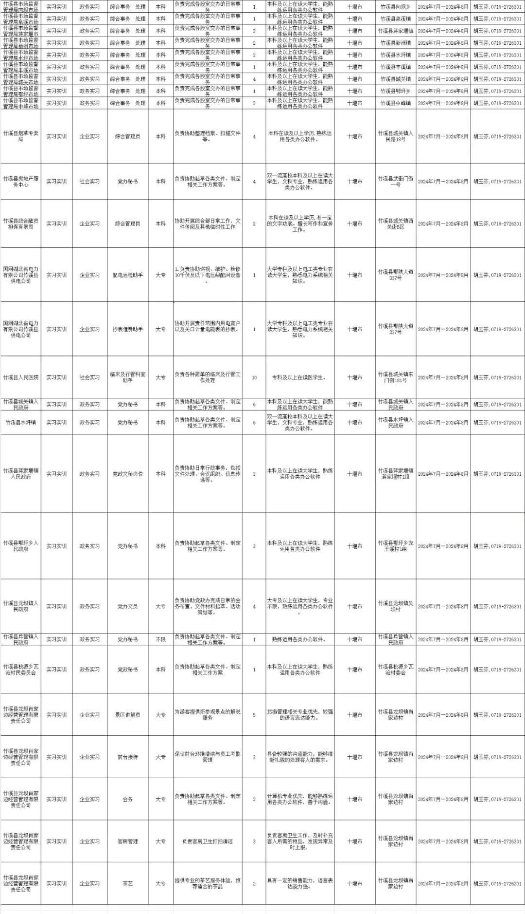 为深入贯彻习近平总书记关于高校毕业生就业工作的重要指示精神,全面落实2024年省政府、市政府十大民生项目,切实推进青年就业创业,持续深入开展大学生“返家乡”社会实践活动,团竹溪县委联合有关部门为同学们提供了100余个优质实践岗位,快来一起看看有没有适合你的岗位吧。