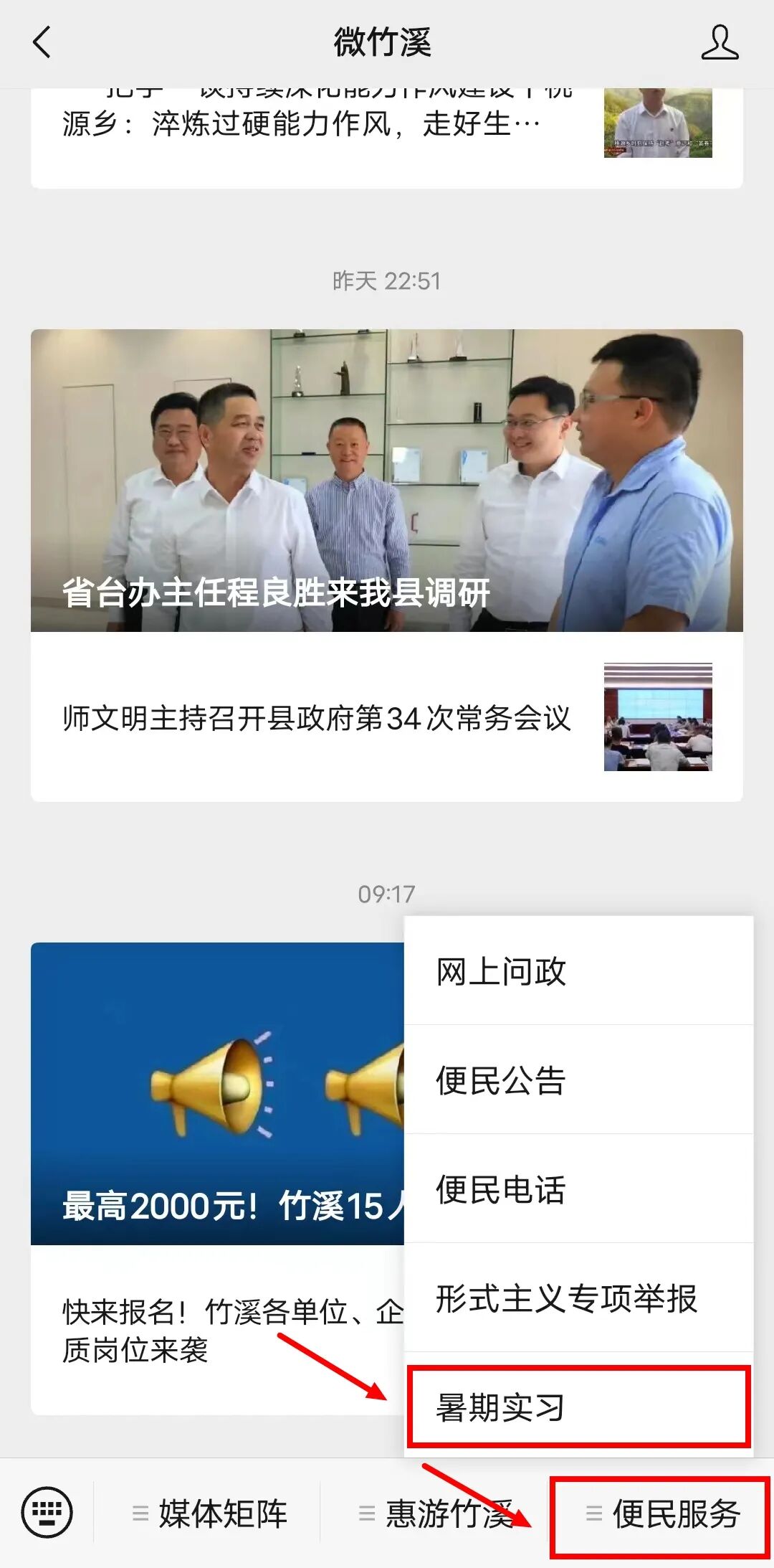 报名方式一:关注“微竹溪”微信公众号,进入首页,点击底部菜单栏“便民服务”,点击子菜单“暑期实习”,进入报名。